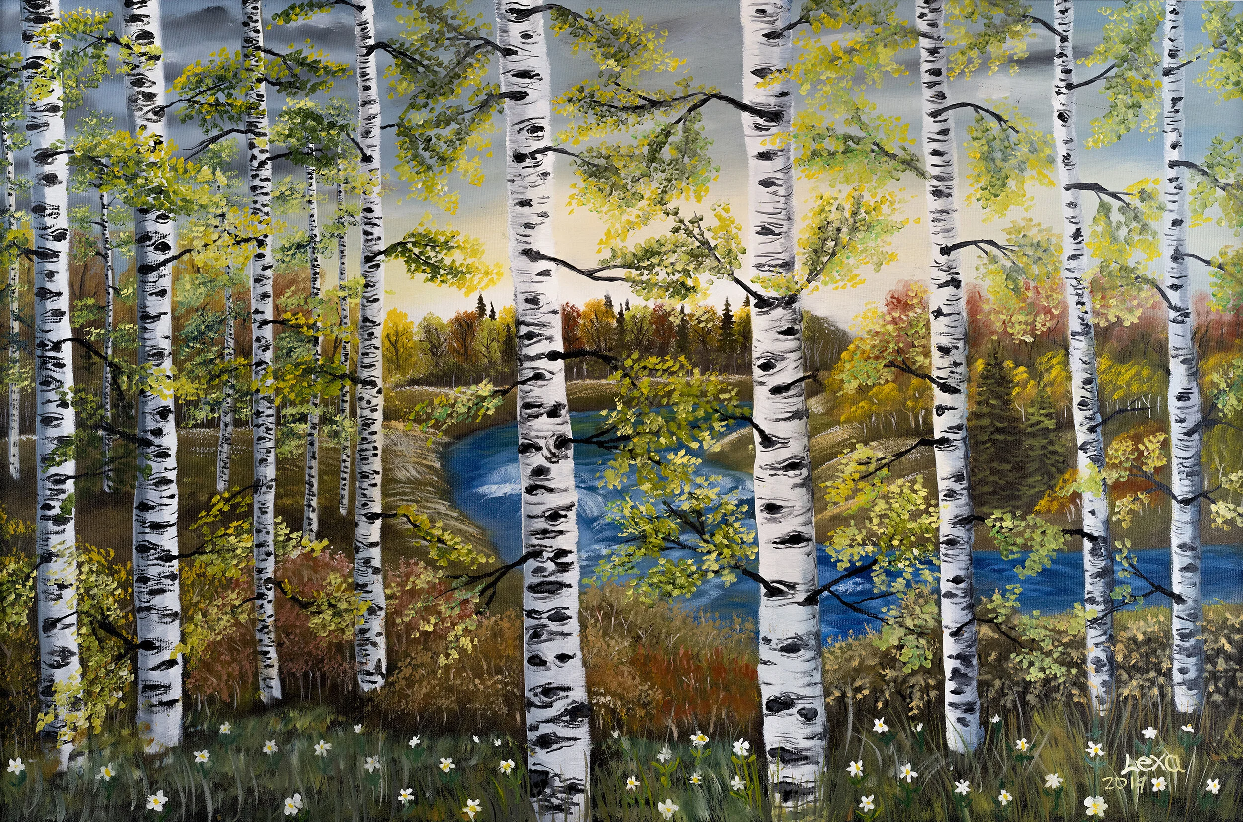 Birches are deciduous trees popular in the Northern Americas because of its slenderness and ghostly bark coloration. I Painted birches across the canvas hiding a paradise of beautiful foliage and river bend. My son felt the birches are like a cage.